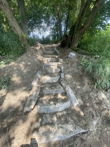 The new staircase consists of 15 stone steps that lead users down a steep slope to the Missisquoi River. The work crew also re-routed an old, eroded path that connects the rail trail to the river, and removed extensive poison ivy from the site.